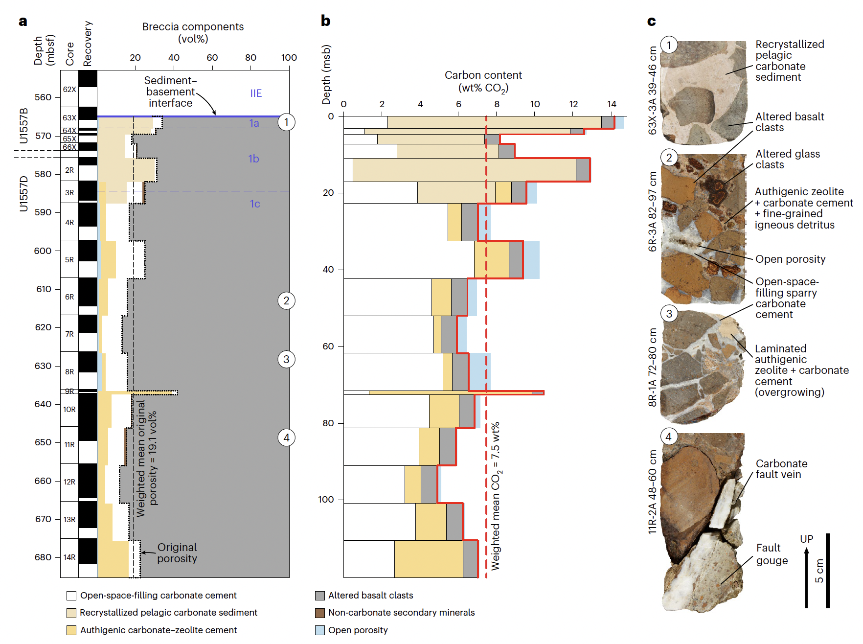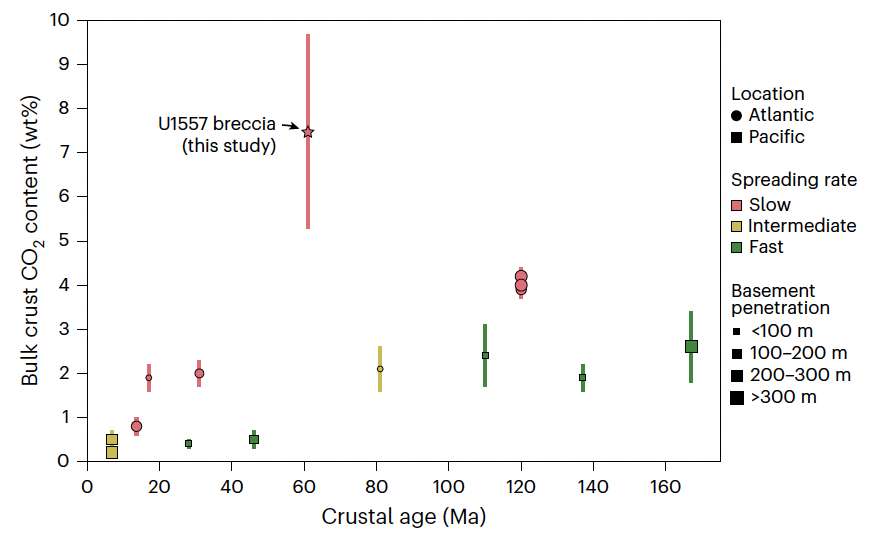 近日,国际大洋发现计划(IODP)390航次科学家在Nature Geoscience发表了一项研究成果,指出慢速扩张洋中脊广泛存在的“坡积角砾岩”(talus breccias)中可发育大量碳酸盐沉淀,从而导致显著的碳吸收,有潜力成为一个重要的地质碳汇(Coggon et al., 2025)。依托横穿南大西洋的系列航次,研究团队获得了大西洋中脊南纬31º西侧7-61百万年的古老洋壳钻孔样品,结果发现大量碳酸盐胶结而成的洋壳角砾岩,角砾包括不同程度蚀变的玄武岩和深海沉积物等(图1,图2)。通过对不同类型角砾和碳酸盐胶结物的碳含量分析,研究团队计算的钻孔岩芯样品的平均CO2含量为7.5 wt.%,是目前对蚀变洋壳碳含量的最高估计(图3)。通过建立几何模型,研究团队进一步估算了这些坡积角砾岩的厚度和规模,进而获得其碳吸收通量。这一碳吸收通量甚至可抵消该区火山活动的碳释放通量,从而达到净碳平衡。研究团队认为,洋中脊的碳吸收通量很大程度上受控于扩张速率导致的洋壳结构变化。不同于快速扩张脊相对稳定、均匀的洋壳结构,慢速扩张脊以发育拆离断层、高角度正断层为特征,可形成大量同构造成因的坡积角砾岩沉积。通过海底热液沿断层的导入和循环以及碳酸盐矿物的沉淀和胶结,这些坡积角砾岩可实现可观的碳吸收,成为重要的地质碳汇。