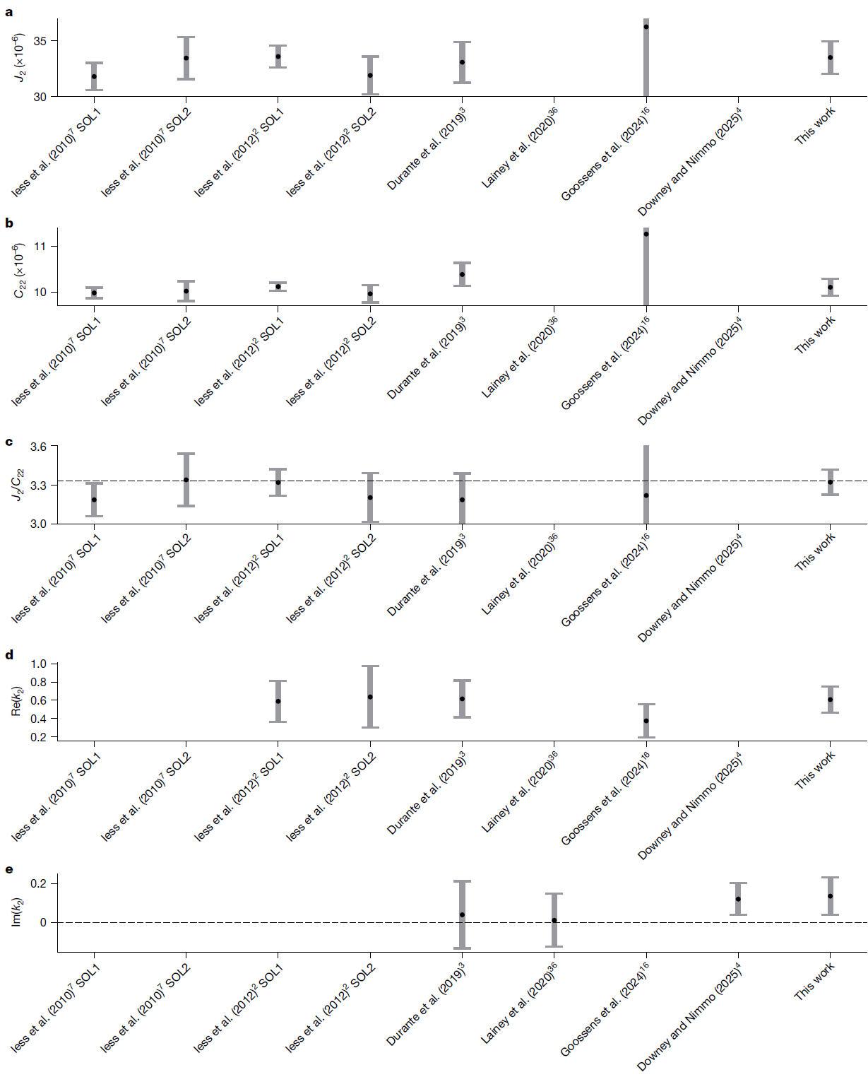 图1 基于卡西尼号的射电跟踪数据获取的土卫六重力场与潮汐勒夫数。(a)J2 (重力场二阶系数); (b) C22 (重力场二阶系数); (c) J2/C22 (用于揭示土卫六内部是否处于静水压平衡状态);(d) Re(k2) (土卫六潮汐Love数实部);(e) Im (k2) (土卫六潮汐Love数虚部)