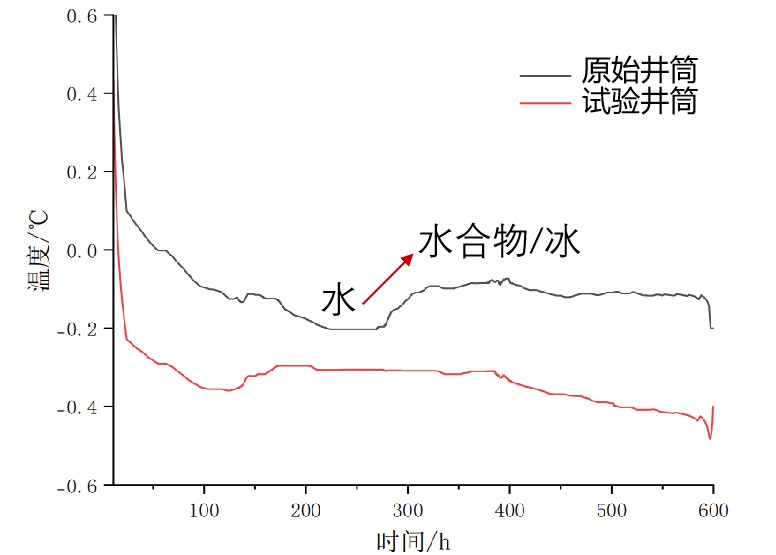 经过近22天的持续温度监测和钻孔观测,科研人员发现,含有低浓度(0.05%)磁流体抑制剂的试验井筒内无法形成二次天然气水合物和水冰;而原始井筒内的水和气容易形成二次水合物和水冰(图1),并在第12天出现明显的水-冰转换温度曲线(图2)。这些结果验证了磁流体的天然气水合物和水冰的抑制效果,并从井筒内的严酷条件证明磁流体抑制剂保障流动的可行性。