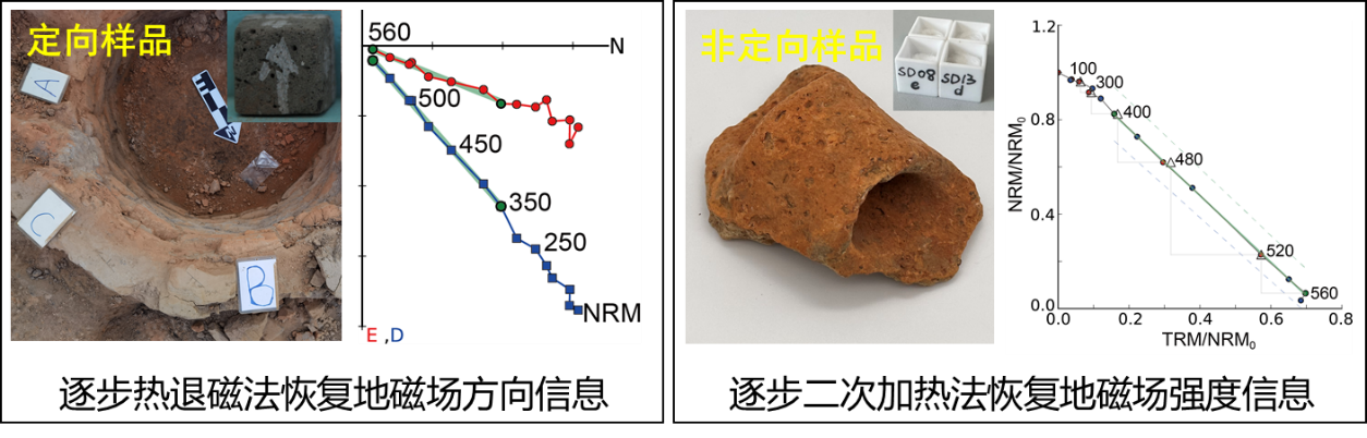 研究人员在遗址现场采集一些经高温烘烤过的样品(图3),包括两类:定向样品(原位遗存,如窑炉,采集时需标明方向)和非定向样品(砖瓦、陶片等)。同时地层中发现碳屑、动物骨骼等定年样品也可以一并采集,用于与地磁测年结果对比。