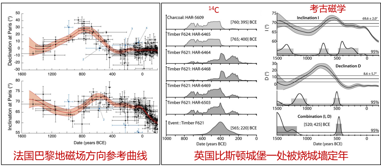 一个具体的例子是研究人员利用法国巴黎地磁场方向参考曲线对英国比斯顿城堡一处被烧城墙进行定年(图5)。考古背景表明该城墙于西欧铁器时代被烧毁,这一时期正对应了碳十四校正曲线的平台期。对遗址现场发现的两份木材及一份碳屑进行碳十四测年,结果给出的年代范围涵盖了六个世纪(765–220 BCE),由于落在碳十四的平台期,定年误差较大。而对城墙采集到的定向古地磁样品应用考古地磁测年,则给出了更为精确的年代范围(520–425 BCE)。因此在某些碳十四测年受限的情况下,考古地磁测年或许可以给出令人满意的结果。