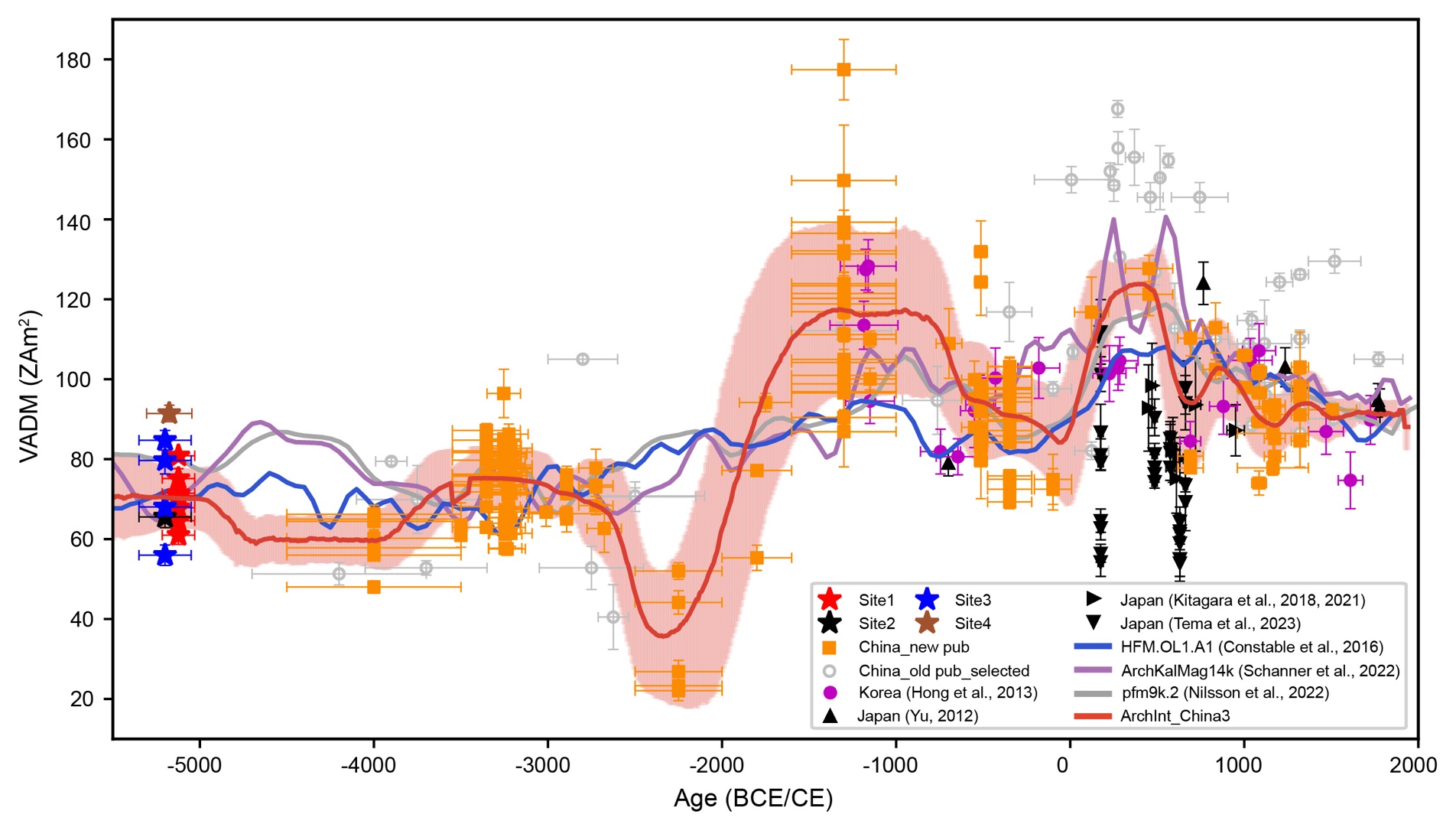 考古地磁测年的精度主要受两方面的影响。一是受地磁场自身变化的影响,在地磁场变化比较平稳的时期,区域地磁场参考曲线也会表现出类似于碳十四校正曲线的平台期,在这一时期,定年误差将会增大。二是受区域地磁场变化参考曲线和全球模型分辨率的影响。考古地磁数据越丰富的时期定年误差越小,数据稀疏的时期误差越大。由于年代越久远的遗址保存越困难,构建地磁场参考曲线的这部分数据相对匮乏也就导致了定年精度随时间向前推移而变低。目前,考古地磁测年在中国尚未得到应用,原因之一就是中国的考古地磁参考曲线分辨率还不够高。800彩票蔡书慧研究团队近期发表在Geophysical Journal International上的成果 (Fang et al. 2025) 将中国地磁场强度参考曲线延伸至~5500 BCE(图6),拓展了地磁测年的范围。但可以看到,在一些时期数据仍存在空白,未来需要更多高质量数据来完善地磁场参考曲线,才能实现更精准的考古地磁测年。