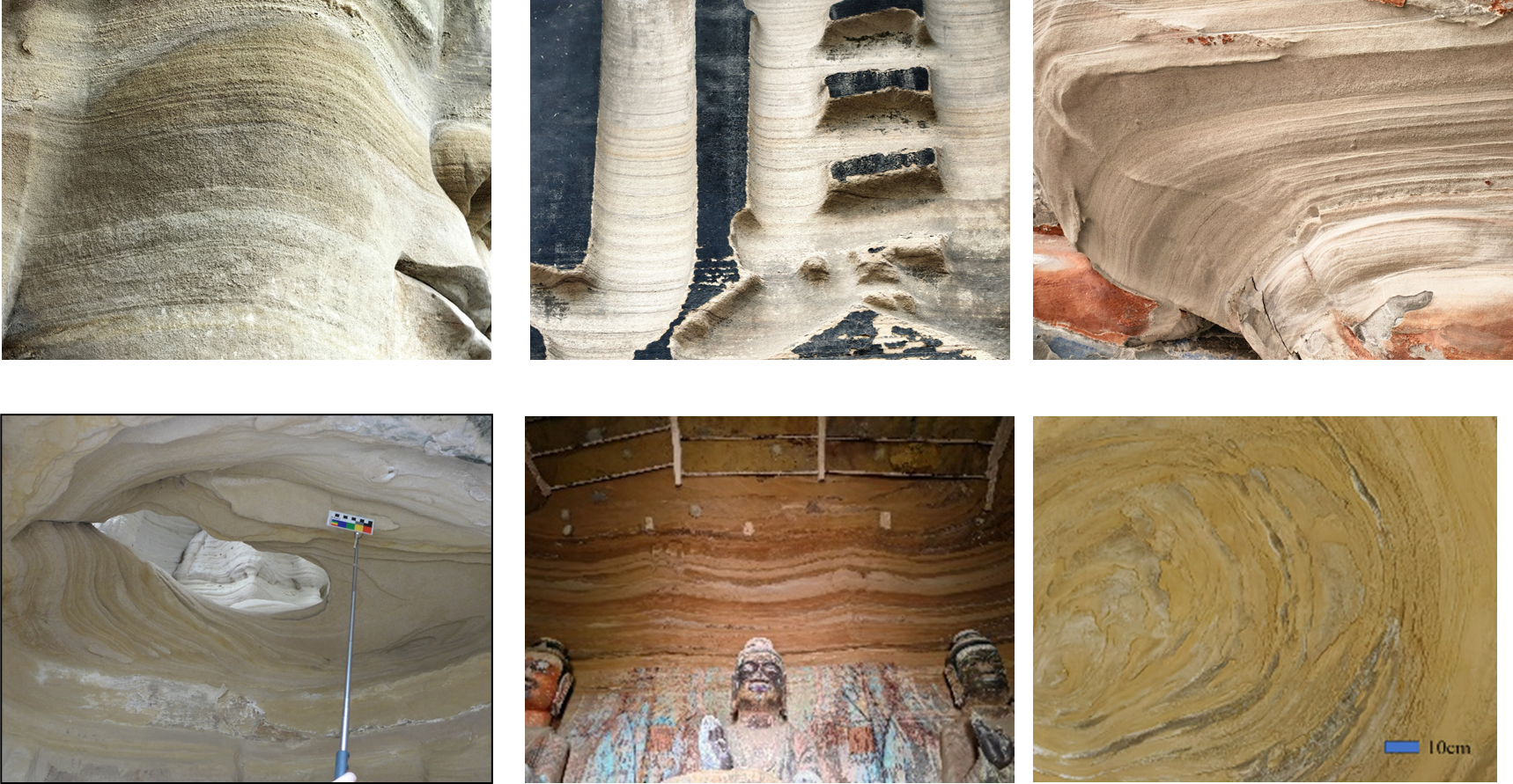 800彩票研究团队经过多年的研究发现,砂岩具有独特的纹层结构。不仅在米级、分米级、厘米级发育纹层结构,在毫米级和微米级也有明显的纹层结构,主要由是由颗粒形态、粒径、排列、物质成分等差异形成的。这些纹层结构形成多尺度界面,制约了水-盐-热的运移,控制石窟的变形和破坏,但在已有的石窟劣化机理和防控研究中一直忽视了纹层结构的影响。近期国家自然科学基金委批准了文物保护方向的首个重点项目“石窟纹层砂岩多尺度劣化机理与防控”,预计2026年开始启动新一轮石窟保护利用研究工作。