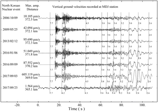 图1 朝鲜6次地下核试验和2017年9月23日朝鲜疑似爆炸事件在牡丹江地震台(MDJ)的重直分量速度记录。