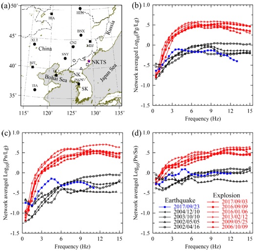 (b)-(d)为不同事件Pg/Lg,Pn/Lg,和Pn/Sn频谱比的台网平均值,红色曲线来自历史核爆,黑色曲线为天然地震,蓝色曲线来自2017年9月23日的事件。该事件显然落入天然地震事件的群组。