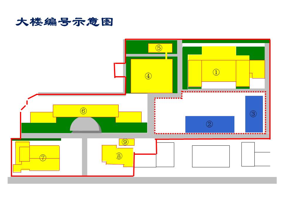 综合楼为1号楼、新建楼A座为2号楼、新建楼B座为3号楼、研究生公寓为4号楼、小五楼为5号楼、旧办公楼为6号楼、实验楼为7号楼、开发楼为8号楼、开发楼北侧压机房为9号楼。