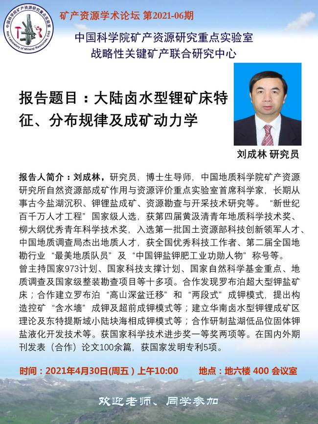 【4.30】矿产资源学术论坛:刘成林 研究员