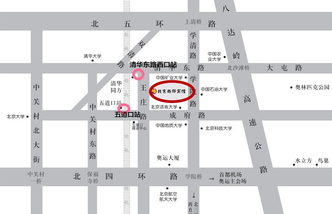 1)首都机场:距离西郊宾馆约30公里。公共交通可搭乘首都机场线至三元桥站,换乘10号线至知春路站,换乘13号线至五道口站,出A口,步行14分钟(约1公里)即可到达;或者在塔台站搭乘空港3路公交车至地铁国展站,步行5分钟(约370米)至国展站换乘地铁15号线至清华东路西口站,出C口步行13分钟(约900米)即可到达。