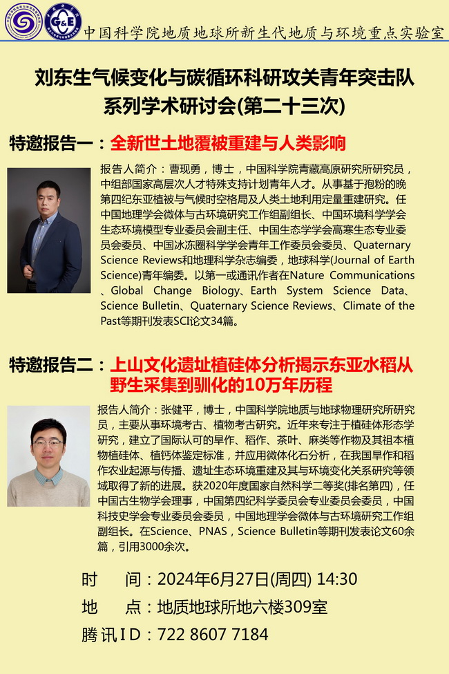 【6.27】刘东生气候变化与碳循环科研攻关青年突击队系列学术研讨会(第二十三次):曹现勇、张健平