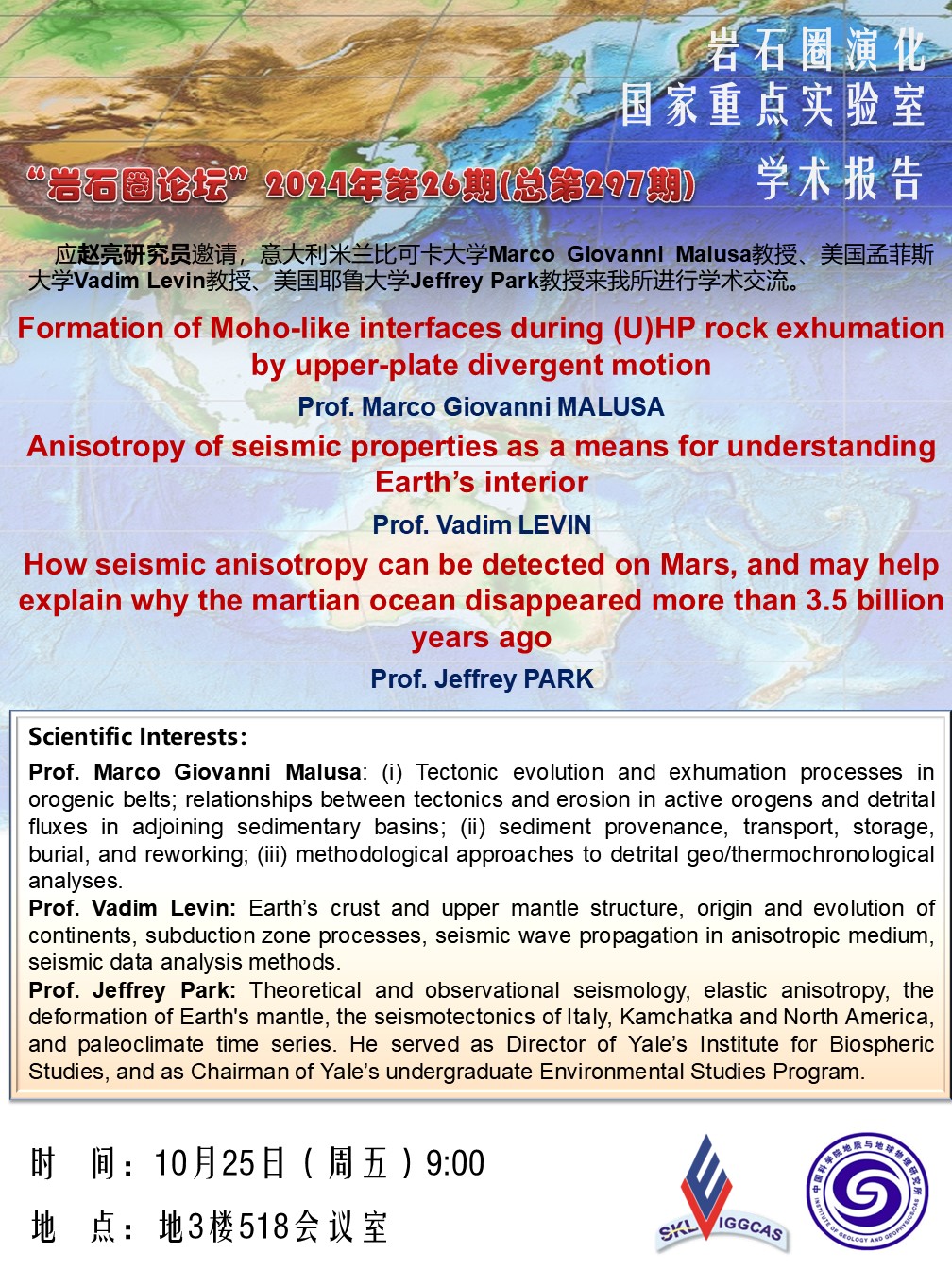 【10.25】岩石圈论坛:Marco Giovanni Malusa教授、Vadim Levin教授、Jeffrey Park教授