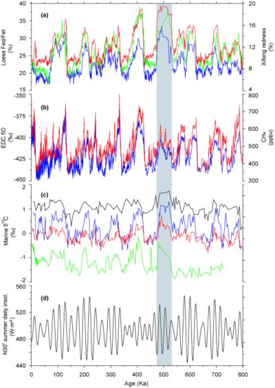 图注:中国黄土、南极冰芯资料、深海记录和日照量的对比