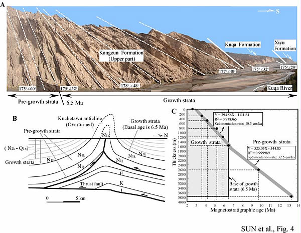 我所新生代地质与环境研究室孙继敏研究员等人对南天山库车前陆盆地秋里塔格背斜的构造变形时间进行了厘定,提出中新世末期至早更新世是天山山脉发生地壳缩短的重要地质时期,其成果最近刚刚发表在著名地学期刊Geology(Sun et al. Magnetostratigraphic data on Neogene growth folding in the foreland basin of the southern Tianshan Mountains. Geology, 2009, 37(11): 1051-1054,点击此处下载该文)。该工作在磁性地层学、生物地层学的基础上建立了厚达3800m的晚新生代地层的时间框架,在构造几何学基础上,识别出同构造沉积,确定了生长地层的起始年龄,结合磁组构的系统变化,指出南天山库车前陆盆地秋里塔格背斜的构造变形始于650万年,而且此次构造变形一直持续到早更新世末期。这一构造变形的发生时间与他们此前在昆仑山北缘及北天山前陆盆地报道的构造变形时间十分接近,说明中新世末期至早更新世是天山山脉发生地壳缩短的重要地质时期。