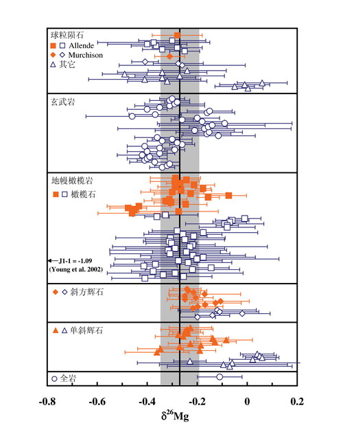 镁在地球中的分布是极其不均匀的,>99%的镁分布在地幔中,因此地幔的平均Mg同位素组成基本上代表了地球的平均Mg同位素组成。地球的平均镁同位素组成对研究地球的早期形成与演化有着重要的意义。然而,由于缺乏系统和全面的研究,地幔的镁同位素变化范围和平均组成还没有确定。