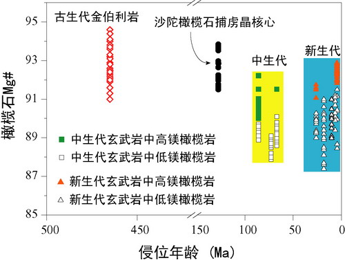 作者对比发现,沙陀橄榄石捕虏晶的核部成分与古生代金伯利岩中的橄榄石捕虏晶、橄榄岩中的橄榄石、新生代鹤壁高镁橄榄岩中的橄榄石相似。前人的研究已经证明金伯利岩中的橄榄岩和鹤壁高镁橄榄岩均代表了古老(太古代)、难熔的岩石圈地幔。因此推断华北克拉通西部在中生代岩石圈地幔仍具有古老、难熔的特征,岩石圈地幔受到的破坏作用程度远弱于东部。