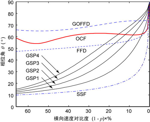 速度对比度定义为(v−v0)/v×100%=(1−p) ×100%。速度对比度小意味者横向速度变化弱,速度对比度大则意味着横向速度变化强。对于每一种方法,曲线下方的误差小于或等于1%,上方则大于1%。点虚线代表分裂步傅立叶法(用SSF标出),短虚线代表傅立叶有限差分法(用FFD标出),长虚线代表全局优化的傅立叶有限差分法(用GOFFD标出),粗实线代表优化的契比雪夫傅立叶法(用OCF标出),细实线代表前四阶广义屏法(分别用GSP1、GSP2、GSP3、GSP4标出)
