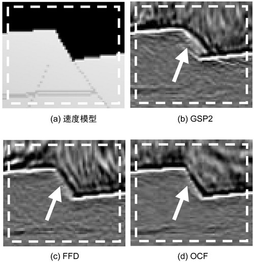(a) 速度模型;(b) 二阶广义屏法;(c) 傅立叶有限差分法;(d) 优化的契比雪夫傅立叶法(本方法)