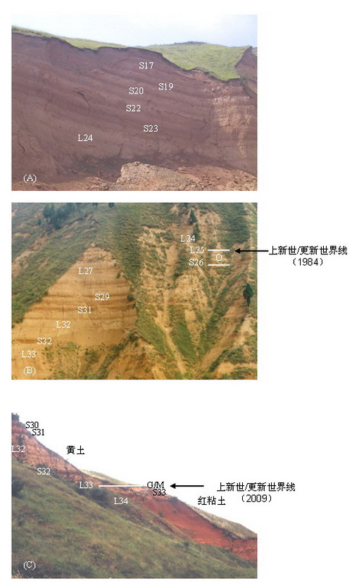图注:A:S17-L24间的午城黄土;B:午城黄土下部。传统上划分的更新世/上新世界线位于黄土层L25附近;C:黄土-红粘土序列。传统上将L33底部定为黄土的底界,本研究将红粘土顶部的一薄层黄土定为第34层黄土(L34),由此将黄土的底界下移了20万年左右。从地层的岩性和土壤特征看,传统的更新世/上新世界线(L25)上下均为黄土-古土壤旋迴,而G/M界线以下为风化较强的红粘土堆积,以上为黄土-古土壤序列。显然,第四纪底界应该划在黄土-红粘土界线附近。