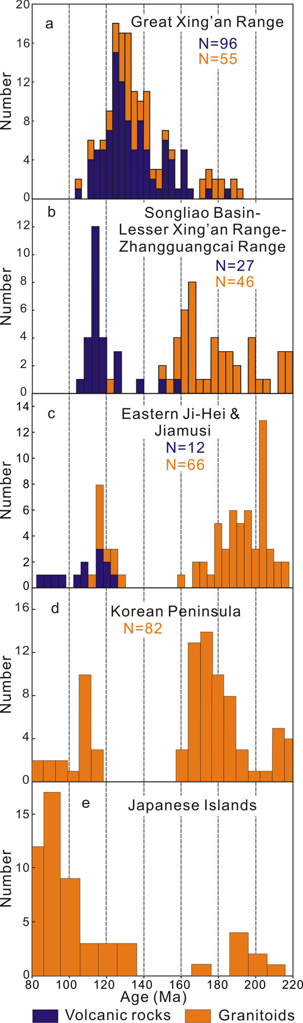 对于东北地区中生代火成岩的年龄数据统计结果显示(图2):大兴安岭地区火山岩与花岗质岩石具有相似的年龄结构;而在张广才岭-小兴安岭-松辽盆地以及吉黑东部-佳木斯地区,火山岩与花岗质岩石具有不同的形成时代:火山岩主要集中在早白垩世期间,而花岗质岩石在主要形成于侏罗纪。总体上,这些岩浆岩在形成时代上可以划分为侏罗纪和早白垩世两期。而在朝鲜半岛和日本地区,这种分期的特征尤其明显。其中侏罗纪岩浆作用从东向西逐渐变新,而早白垩世岩浆作用具有相反的趋势,即自西向东逐渐变新。两期岩浆作用之间具有一个明显的自西向东逐渐加大的岩浆平静期。