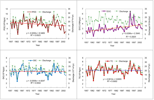 图1 西江河流颗粒有机碳(a),溶解有机碳(b),溶解无机碳(c)及总碳(d)长期变化趋势