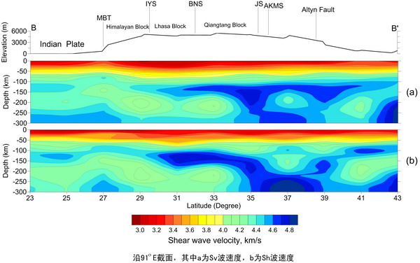 (四)在拉萨块体北部和羌塘块体下方,存在地盾式的高速上地幔(图2),这可能是印度板块向北俯冲的迹象,其前沿已经越过班公湖-怒江缝合带(BNS)并继续向北,甚至达到金沙江缝合带(JS)附近。