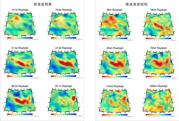 800彩票青藏高原研究室陈赟助理研究员及其合作者在系统收集青藏高原周边地区13个地震台站记录的1980年以来地震数据的基础上,通过提取瑞利波(Rayleigh Wave)和勒夫波(Love Wave)10~105s群速度频散(图1),进而反演研究区地壳上地幔的三维横波速度结构(图2)。通过系统分析和定量计算表明,该项研究所利用的地震射线平均路径长度约2000km,对青藏高原本体的覆盖比例达75%左右,横向分辨可达200 km左右;震源误差引起的频散误差与频散测量的系统误差接近,均值 ≤0.02 km/s;通过进一步的分析和论证,表明经典射线理论在本项研究中仍然是适用的,而基于目前资料的积累程度,更小尺度的网格划分是不现实的。