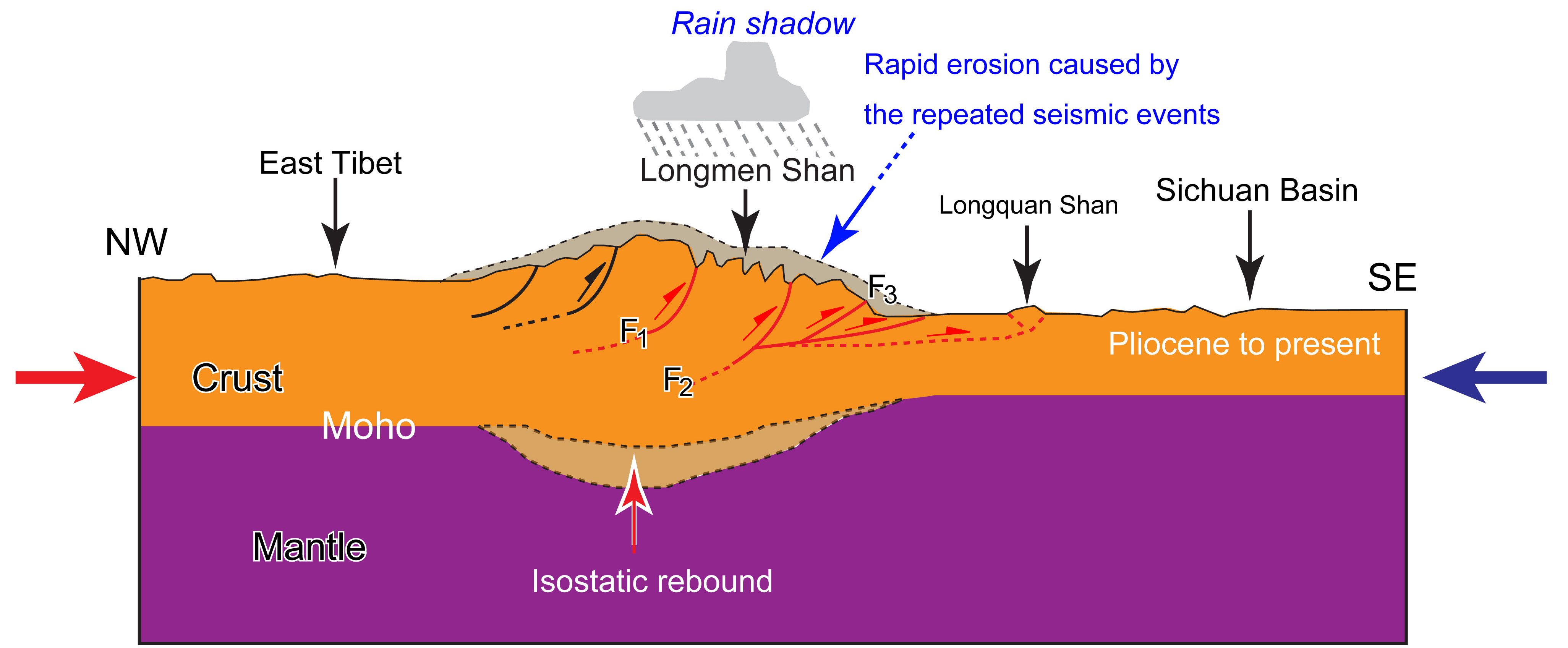 目前,关于青藏高原东缘龙门山的构造隆升的地球动力学机制主要有两个流行观点:第一种是美国麻省理工学院的Royden和Clark提出的下地壳流(Channel flow)机制。但是,这种机制是建立在数值模拟基础之上,缺少任何地质证据的支持;第二种观点是以美国哈佛大学的Hubbard和Shaw提出的地壳挤压缩短变形的机制,但是这种机制是基于龙门山断裂带西南段的构造变形剖面,而龙门山中段和北东段缺少前陆构造变形。同时,龙门山地区侵蚀作用非常强烈,所以,仅仅靠地壳的构造挤压缩短变形,无法形成青藏高原东缘龙门山高陡的地貌特征。
