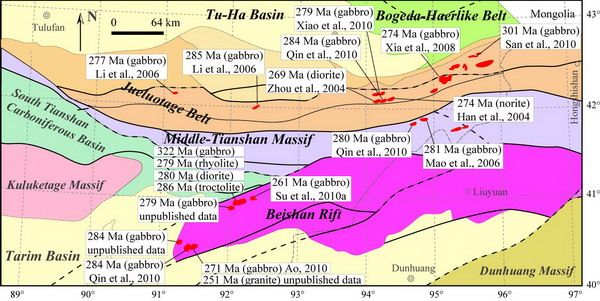 北山是中亚造山带南缘的一个重要构造单元,对研究中亚造山带与塔里木板块和华北克拉通的关系及其演化具有重要意义。北山地区广泛出露蛇绿岩、玄武岩以及镁铁-超镁铁侵入岩,已得到越来越多地质学家的关注。但是,因该区的总体研究程度较低,尚有不少问题答案不明确:北山多处酸性岩在诸多地质图上被划为石炭纪而缺乏精确的年代学数据,而其成因及其形成构造背景未有定论;北山是否存在石炭纪镁铁-超镁铁岩;北山是晚古生代的大陆裂谷还是岛弧等。