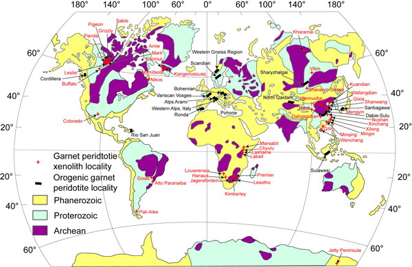 图2 全球克拉通和非克拉通石榴石橄榄岩捕虏体与造山带石榴石橄榄岩块体分布图
