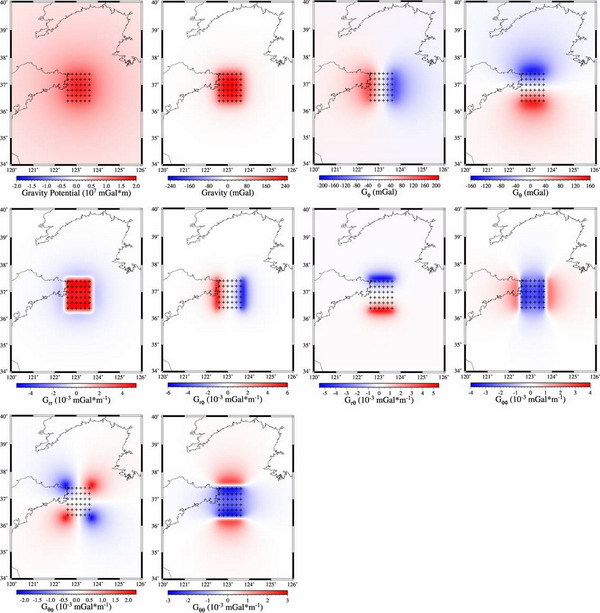 图1 位于5-32.5 km深度的密度异常体在地表的重力效应,包括重力位、三个重力矢量和六个独立的重力梯度张量