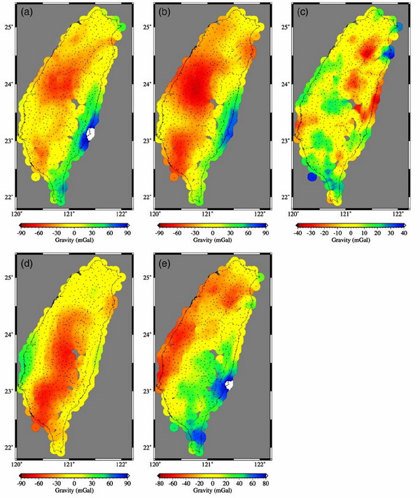 图2 (a)台湾地区的布格重力异常;(b)由地震到时和重力联合反演获得的三维壳幔速度结构在地表的重力异常分布;(c)观测布格重力异常与图(b)中所示正演重力异常之差;(d)仅由地震到时反演获得的三维壳幔速度结构在地表的重力异常分布;(e)观测布格重力异常与图(d)中所示正演重力异常之差。黑点代表了布格重力异常观测点的位置。从图2中可以看出,联合反演得到的三维壳幔模型的重力异常与观测重力异常大体上吻合的较好,而仅由地震数据反演的结果则存在较大偏差,表明了联合反演的必要性。