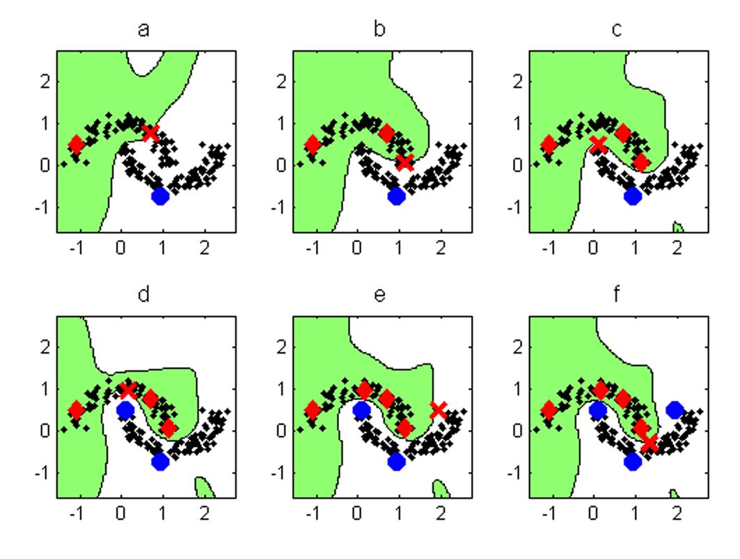 附图说明:图中是采用双月模型仿真数据集来训练A-LapSVM主动半监督学习器的训练过程。该数据集包含200个样本,实验中初始化每类中有一个标签数据。图中红色的菱形代表正类,蓝色的圆形为负类,黑点为无标签数据(即假设不知道类别标签),红色叉形为本次迭代选择的将要赋予标签的样本点。由图中可以看出,经过5次迭代,分类器已经可以完全把两类数据分开。在第6步已经取得了很好的分类效果(图中的f所示)。