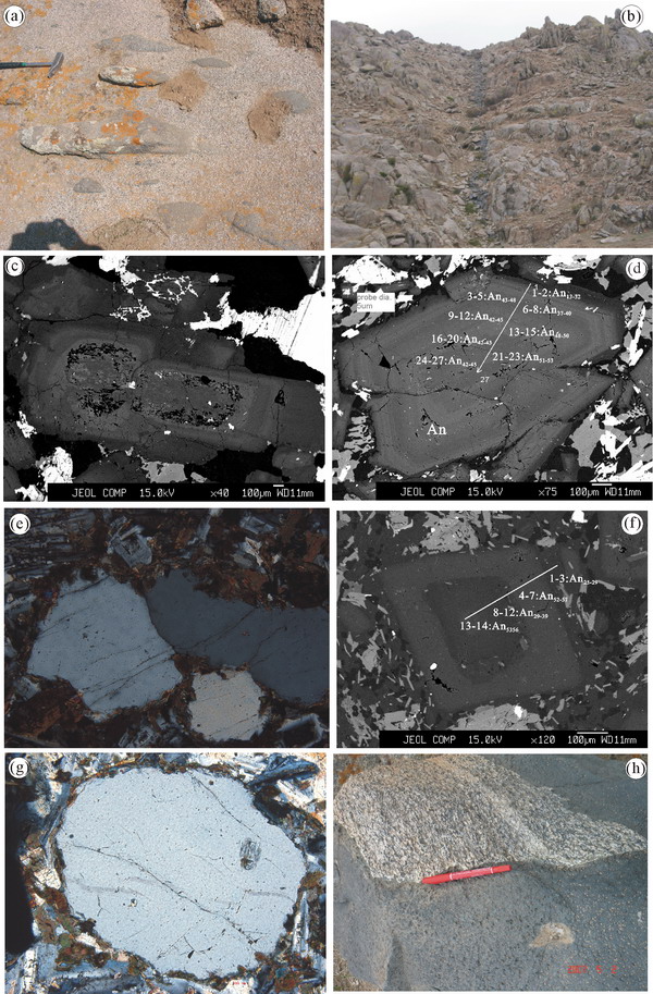 附图说明 固阳岩基中各类不同尺度的岩浆混杂现象(a)闪长岩-花岗闪长岩中呈强烈流动状态分布的基性微粒包体(MME);(b)闪长岩中的基性岩墙;(c)石英闪长岩中具复杂环带结构的斜长石;(d)花岗闪长岩中具复杂环带结构的斜长石;(e)基性微粒包体中的石英-角闪石眼球构造;(f)基性岩墙中具复杂环带结构的斜长石;(g)基性岩墙中的石英-角闪石眼球结构;(h)基性岩墙中的石英闪长岩捕虏体