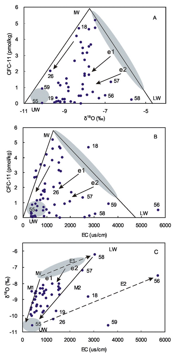 箭头指河水与地下水之间混合过程。阴影表示不同的混合端元。CFCs数据有助于区分复杂水文过程
