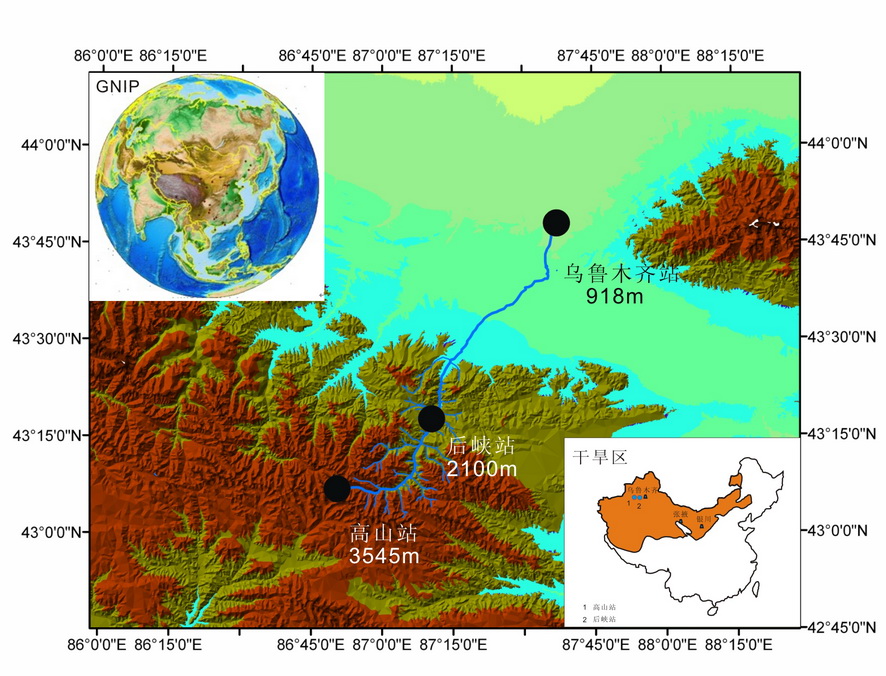 干旱区因本地蒸发强烈,水分内循环对同位素演化的影响十分明显。然而,关于降水过程中同位素的演化缺乏研究。新疆是世界三大极端干旱区之一,位于其境内的天山更有 “中亚水塔”之誉,水循环与水资源研究的地位十分突出, 是开展此类研究的理想区域。