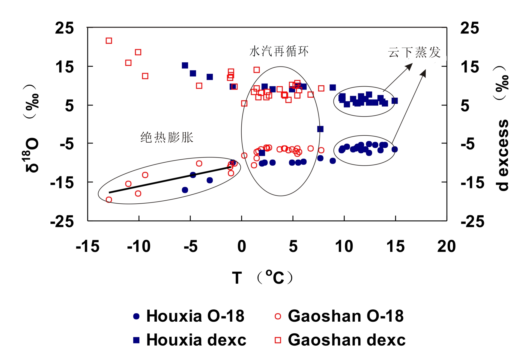 图2:天山降水同位素d18O,氘盈余与气温关系