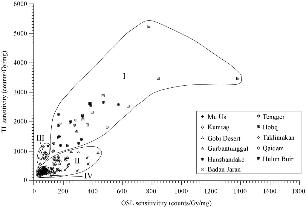 图1:中国北方不同沙漠中石英(90-125 μm)释光绝对灵敏度变化特征。