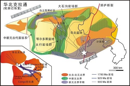 附图说明:华北克拉通新元古代大石沟基性岩墙群与裂谷系分布及9亿年前大陆格局假想图