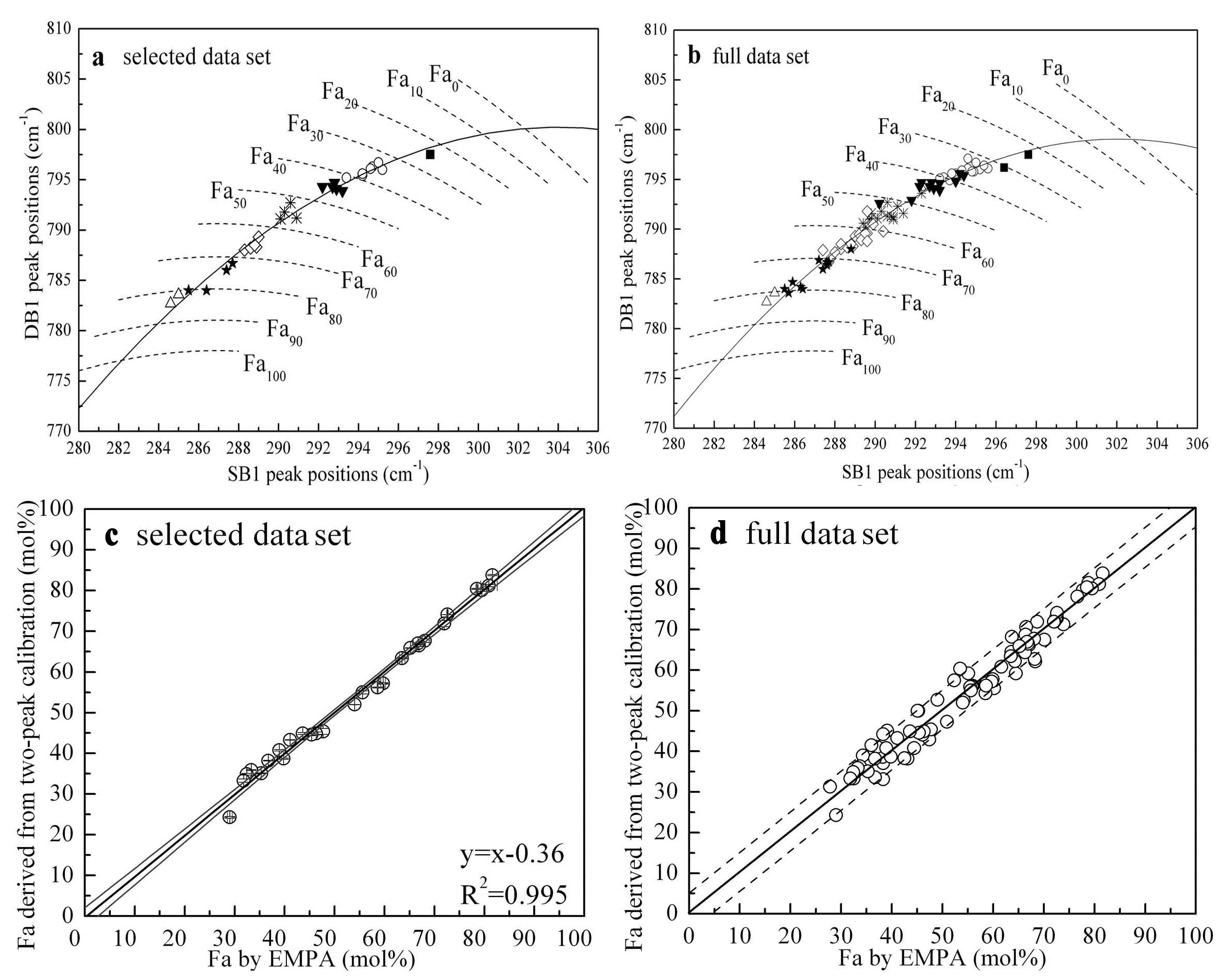 附图说明:(a) 和 (b) 将SB1和DB1双峰峰位投点至SB1-DB1 平面(a) 选择分析点,(b) 全部分析点。图中虚线为利用双峰峰位与林伍德石Fa值拟合出抛物面,并投影至SB1-DB1平面形成的Fa值等高线,灰色实线为双峰峰位的拟合曲线。(c)和(d) 利用双峰拟合计算出的林伍德石Fa 值与EMPA 实测值投点。(c) 选择分析点。图中灰色实线为95%置信区间。(d) 全部分析点。图中虚线区域为EMPA值 ± 5 mol%。