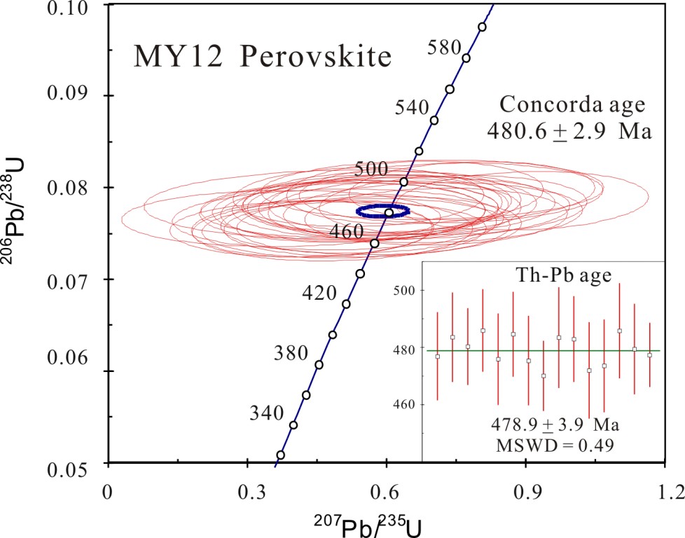 图1:钙钛矿U-Pb和Th-Pb年龄的离子探针同时测定,年龄一致指示体系封闭