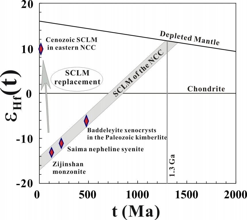 图2:华北岩石圈减薄前岩石圈地幔Hf同位素演化趋势,揭示1.3Ga地幔交代事件