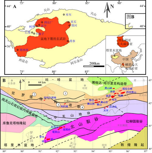 图1:A)塔里木盆地二叠纪溢流玄武岩分布图. B)东天山和北山镁铁-超镁铁岩体分布图