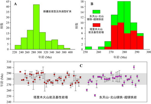 图2:A)新疆岩浆型及热液型矿床的成矿年代学(119个数据)统计结果表明成矿峰期为280~300Ma. B)东天山和北山镁铁-超镁铁岩(33个数据)及塔里木火山岩(主要为玄武岩)和基性岩墙的年代学(38个数据)显示岩浆活动峰期为~280Ma. C)年代学数据及其误差统计结果