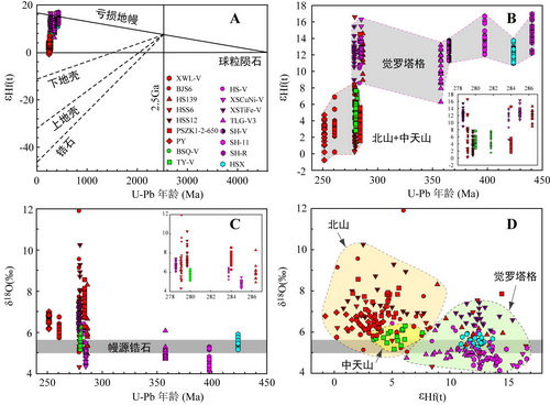 图3:东天山-北山镁铁-超镁铁岩及其相关火山岩中锆石的Hf-O同位素相关性图解