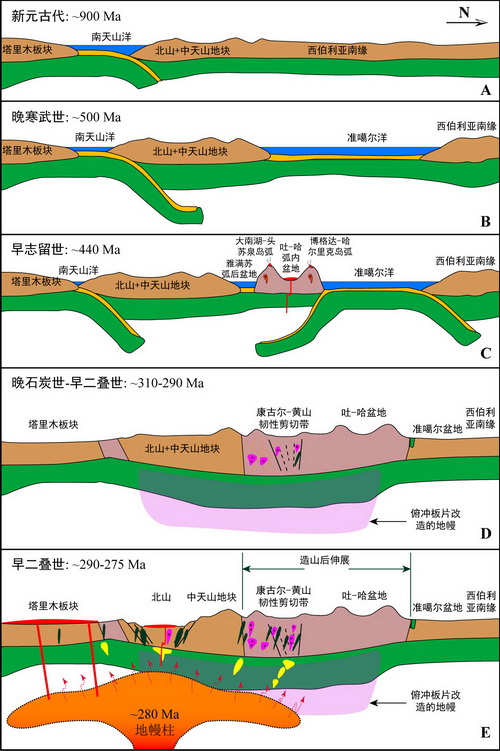 全岩的εNd(t)值和微量元素以及锆石Hf-O同位素表明其岩浆源区具有亏损地幔的特征并经历了俯冲板片的改造。结合锆石Hf亏损地幔模式年龄及区域上蛇绿岩的年代学研究表明北山地区南侧的南天山洋可能在~900Ma时开始向北俯冲,至~400Ma大洋闭合;东天山以北的准噶尔洋可能在~600Ma时开始向南俯冲,至~310Ma时大洋闭合,进入碰撞造山阶段,在290~269Ma期间为造山后伸展阶段;塔里木地区~280Ma的地幔柱活动在东天山、北山与造山后伸展的叠加作用使得幔源岩浆活动广泛发育,系叠置在造山带背景上的早二叠世地幔柱;北山地区熔融程度高,可能地幔柱的头部(图4)。
