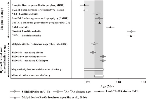图2:多龙富金斑岩铜矿床的岩浆演化序列和成矿岩浆-热夜演化时限。
