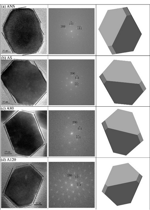 图1:AMB-1磁铁矿沿[011]晶带轴的高分辨透射电子显微镜照片和重构的理想晶型
