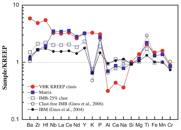 VHK KREEP角砾具有极富不相容元素的特征,其含量较假定的KREEP组成 (据Warren & Wasson, 1979) 约高3倍。SaU 169陨石冲击熔岩的基质(Matrix)与VHK KREEP角砾有相似的组成,但钾与其他不相容元素分异而明显贫化。