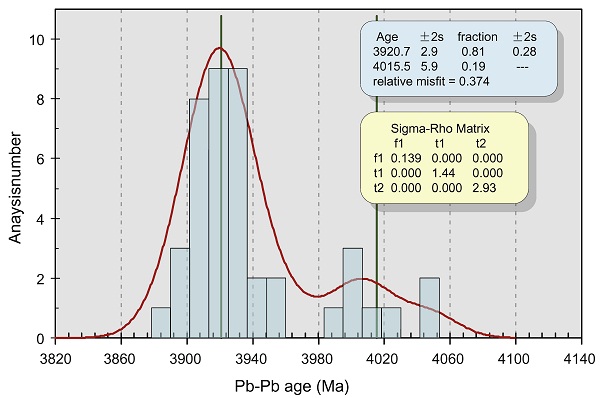 图2 SaU 169陨石中各种产状锆石的Pb-Pb年龄谱图,主峰的年龄为3920.7±2.9 Ma