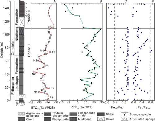 地质与地球物理研究所油气资源室汪建国博士后在合作导师陈代钊研究员指导下选择湖南西部跨越E-C界线附近的深水剖面为研究对象,以δ13Corg、δ34Spy以及铁组份为分析手段,重建了E-C转折期深海的演化过程。结果表明:E-C海洋的演化可分成两个阶段(阶段1和阶段2)。阶段1(Phase 1):具有高的FeHR/FeT比值(所有样品都大于0.38)以及低的Fep/FeHR比值(绝大部分样品都小于0.8),显示该时期深海为富铁缺氧,但在牛蹄塘组下部有两个样品的Fep/FeHR比值大于0.8,说明在早寒武世期间这种富铁缺氧的海水曾短暂的被硫化缺氧水体所取代,同时该时期δ13Corg、δ34Spy值具有一定的耦合关系。阶段2(Phase 2):与阶段1存在明显的区别,FeHR/FeT比值快速降低(总体低于0.38),Fep/FeHR比值向上有上升的趋势,但没超过0.5,δ34Spy从30‰快速下降到-10‰,而且与δ13Corg变化明显脱耦,说明该时期深海快速从缺氧转变为富氧环境,这与大量海绵个体以及海绵骨针的出现相一致。