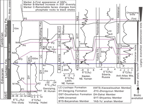 图2:湘西龙鼻咀剖面与国内外其它地区碳同位素对比图